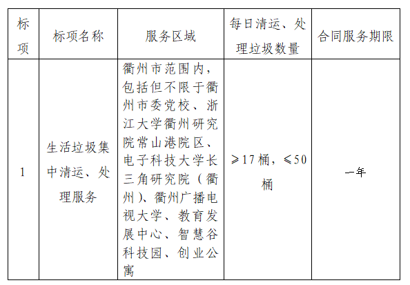 一、采購項目名稱:衢州市瑞城科技產(chǎn)業(yè)服務(wù)有限公司運營區(qū)域生活垃圾集中清運、處理服務(wù)采購。
