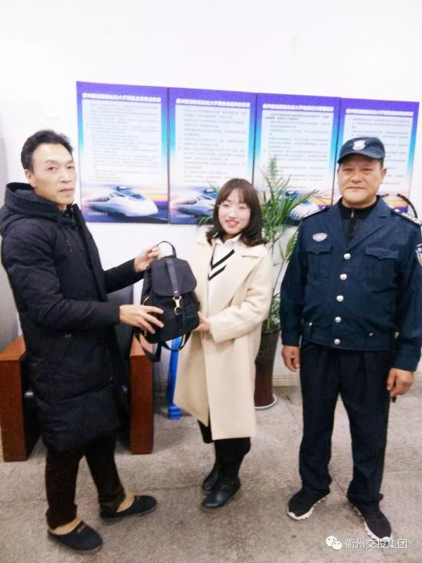 綜合客運樞紐公司的保安人員在衢州火車站出站大廳交接班巡查時發(fā)現(xiàn)一只女式背包,保安人員拾金不昧,將失物完璧歸趙。