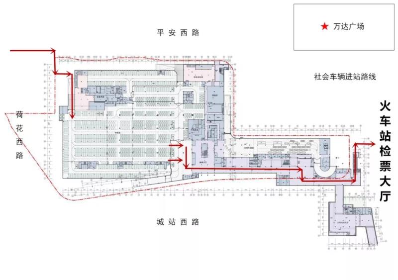 旅客從鐵路出站閘機口走出,右轉后步行20米左轉,經(jīng)過第一、第二換乘大廳抵達停車場具體停車位上車后,車輛即可根據(jù)停車場內的標識標志,沿著車道由東向西從城站西路駛出。