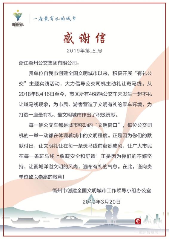 市交通投資集團有限公司副總經(jīng)理葉建國表示,“這封感謝信讓我們倍感驚喜和意外,我們將繼續(xù)通過有禮公交的打造,宣傳衢州有禮的品牌形象,制定更嚴密的措施,為創(chuàng)建全國文明城市添磚加瓦?!?/span>
