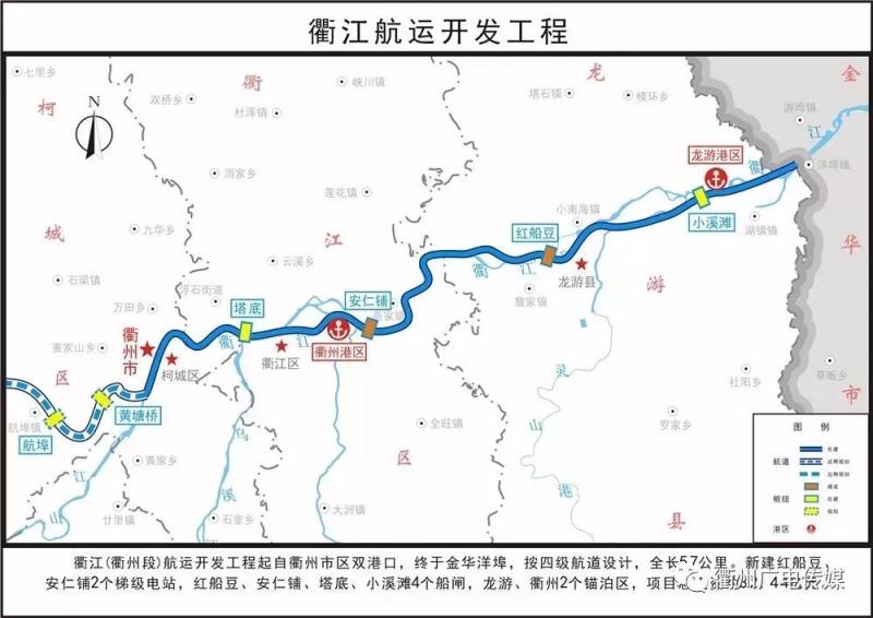 衢江(衢州段)航運開發(fā)工程是錢塘江中上游航運復(fù)興工程的重要組成部分,起自衢州市區(qū)雙港口,終至金華洋埠,按四級航道設(shè)計,全長57公里,建成后,可通航500噸級船舶,船閘單向通航能力1050萬噸/年。