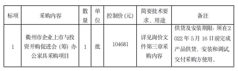 參照《中華人民共和國政府采購法》、《政府采購貨物和服務(wù)招標(biāo)投標(biāo)管理辦法》等規(guī)定,衢州市智信工程咨詢有限公司受衢州市智慧置業(yè)有限公司的委托,就衢州市企業(yè)上市與投資并購促進(jìn)會(huì)(籌)辦公家具采購項(xiàng)目進(jìn)行詢價(jià),本項(xiàng)目為非依法必招項(xiàng)目,現(xiàn)請合格供應(yīng)商參加投標(biāo)。