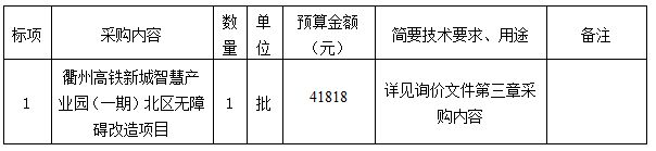 參照《中華人民共和國政府采購法》、《政府采購貨物和服務招標投標管理辦法》等規(guī)定,衢州市智信工程咨詢有限公司受衢州市智慧產業(yè)投資發(fā)展有限公司的委托,就衢州高鐵新城智慧產業(yè)園(一期)北區(qū)無障礙改造項目進行詢價,本項目為非依法必招項目,現(xiàn)請合格供應商參加投標。