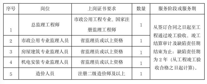 服務(wù)期:從簽訂合同之日起至工程通過(guò)竣工驗(yàn)收、竣工結(jié)算審計(jì)及缺陷責(zé)任期結(jié)束為止;缺陷責(zé)任期為2年(從工程竣工驗(yàn)收合格之日起計(jì)算)。