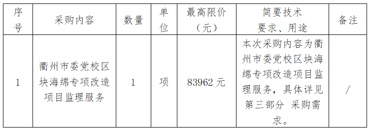 根據(jù)《衢州市國(guó)有企業(yè)采購(gòu)管理辦法(試行)》規(guī)定并參照《中華人民共和國(guó)招標(biāo)投標(biāo)法》、《中華人民共和國(guó)政府采購(gòu)法》等有關(guān)規(guī)定,衢州市兩山工程咨詢管理有限公司受衢州市智慧產(chǎn)業(yè)投資發(fā)展有限公司的委托,對(duì)衢州市委黨校區(qū)塊海綿專項(xiàng)改造項(xiàng)目監(jiān)理服務(wù)進(jìn)行詢價(jià)采購(gòu),歡迎準(zhǔn)時(shí)參加。