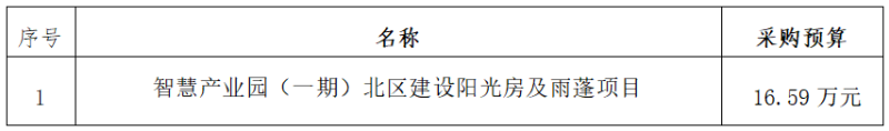 一、采購(gòu)項(xiàng)目名稱(chēng):智慧產(chǎn)業(yè)園(一期)北區(qū)建設(shè)陽(yáng)光房及雨蓬項(xiàng)目