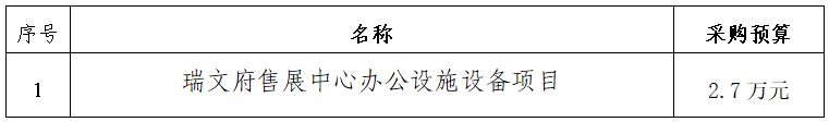 根據(jù)《衢州市國有企業(yè)采購管理辦法(試行)》規(guī)定,以公開詢價方式對瑞文府售展中心辦公設(shè)施設(shè)備項目進行采購,歡迎合格的供應(yīng)商參加。