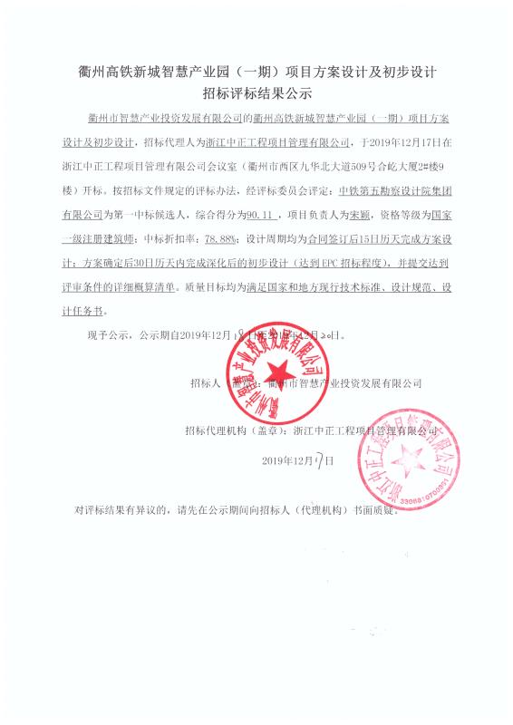 衢州市智慧產(chǎn)業(yè)投資發(fā)展有限公司的衢州高鐵新城智慧產(chǎn)業(yè)園(一期)項目方案設(shè)計及初步設(shè)計,招標(biāo)代理人為浙江中正工程項目管理有限公司,于2019年12月17日在浙江中正工程項目管理有限公司會議室(衢州市西區(qū)九華北大道509號合屹大廈2#樓9樓)開標(biāo)。按招標(biāo)文件規(guī)定的評標(biāo)辦法,經(jīng)評標(biāo)委員會評定:中鐵第五勘察設(shè)計院集團有限公司為第一中標(biāo)候選人,綜合得分為90.11 ,項目負(fù)責(zé)人為宋穎,資格等級為國家一級注冊建筑師;中標(biāo)折扣率:78.88%;設(shè)計周期均為合同簽訂后15日歷天完成方案設(shè)計;方案確定后30日歷天內(nèi)完成深化后的初步設(shè)計(達到EPC招標(biāo)程度),并提交達到評審條件的詳細(xì)概算清單。質(zhì)量目標(biāo)均為滿足國家和地方現(xiàn)行技術(shù)標(biāo)準(zhǔn)、設(shè)計規(guī)范、設(shè)計任務(wù)書。