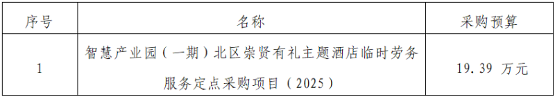 一、采購項目名稱:智慧產(chǎn)業(yè)園(一期)北區(qū)崇賢·有禮主題酒店臨時勞務服務定點采購。