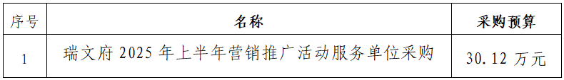 一、采購(gòu)項(xiàng)目名稱:瑞文府2025年上半年?duì)I銷推廣活動(dòng)服務(wù)單位采購(gòu)項(xiàng)目