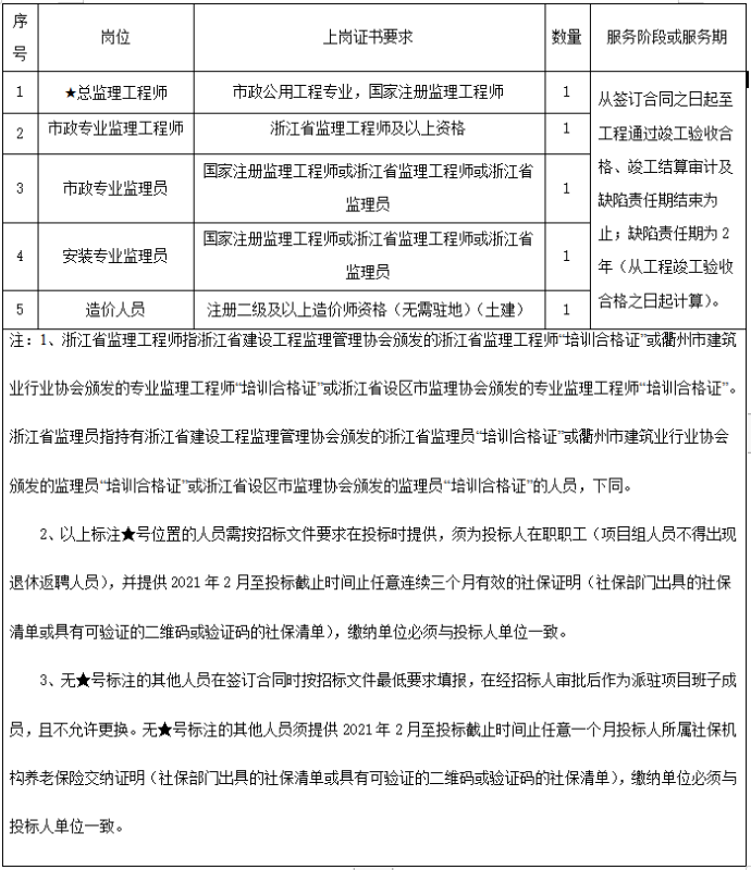 要求具備有效的國家注冊監(jiān)理工程師證書,注冊專業(yè)為市政公用工程?!緡易员O(jiān)理工程師:衢州市區(qū)(含市本級、柯城區(qū)、衢江區(qū)、西區(qū)、綠色產(chǎn)業(yè)集聚區(qū),余同)外不得有在建工程的監(jiān)理業(yè)務(含已中標工程或為第一中標候選人的監(jiān)理業(yè)務,余同),衢州市區(qū)不得有2個在建工程的監(jiān)理業(yè)務】。