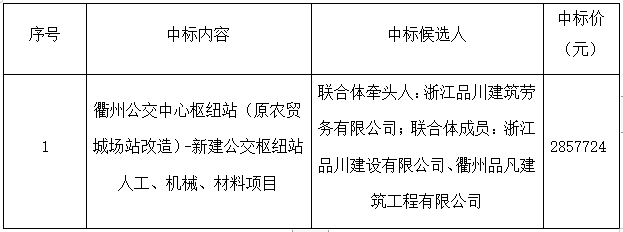 根據(jù)《中華人民共和國招標投標法》等有關法律法規(guī)的規(guī)定,浙江建安工程管理有限公司受浙江衢交建設工程有限公司委托,對其衢州公交中心樞紐站(原農(nóng)貿城場站改造)-新建公交樞紐站人工、機械、材料項目采用公開招標方式進行招標。浙江建安工程管理有限公司于2021年6月17日09時30分在衢州市交通投資集團二樓開標廳(衢州市柯城區(qū)白云街道花園中大道86號)進行開評標。評標結果及相關事宜現(xiàn)公示如下: