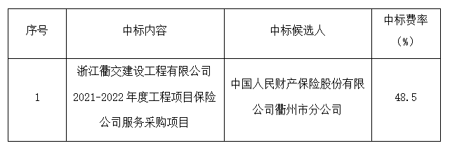 根據(jù)《中華人民共和國(guó)招標(biāo)投標(biāo)法》等有關(guān)法律法規(guī)的規(guī)定,浙江建安工程管理有限公司受浙江衢交建設(shè)工程有限公司委托,對(duì)其浙江衢交建設(shè)工程有限公司2021-2022年度工程項(xiàng)目保險(xiǎn)公司服務(wù)采購(gòu)項(xiàng)目采用公開招標(biāo)方式進(jìn)行招標(biāo)。浙江建安工程管理有限公司于2021年08月17日09時(shí)30分在衢州市交通投資集團(tuán)二樓開標(biāo)廳(衢州市柯城區(qū)白云街道花園中大道86號(hào))進(jìn)行開評(píng)標(biāo)。評(píng)標(biāo)結(jié)果及相關(guān)事宜現(xiàn)公示如下: