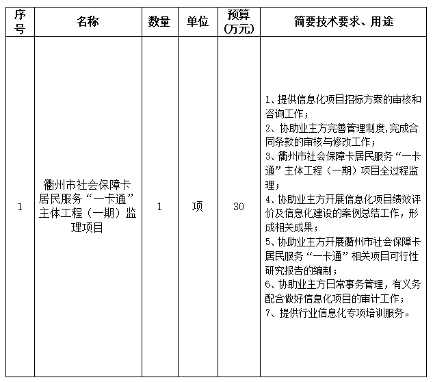 項目名稱:衢州市社會保障卡居民服務(wù)“一卡通”主體工程(一期)監(jiān)理項目