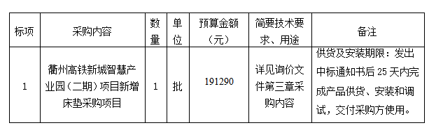 參照《中華人民共和國(guó)政府采購(gòu)法》、《政府采購(gòu)貨物和服務(wù)招標(biāo)投標(biāo)管理辦法》等規(guī)定,衢州市智信工程咨詢有限公司受衢州市智慧產(chǎn)業(yè)投資發(fā)展有限公司的委托,就衢州高鐵新城智慧產(chǎn)業(yè)園(二期)項(xiàng)目新增床墊采購(gòu)項(xiàng)目進(jìn)行詢價(jià),本項(xiàng)目為非依法必招項(xiàng)目,現(xiàn)請(qǐng)合格供應(yīng)商參加投標(biāo)。