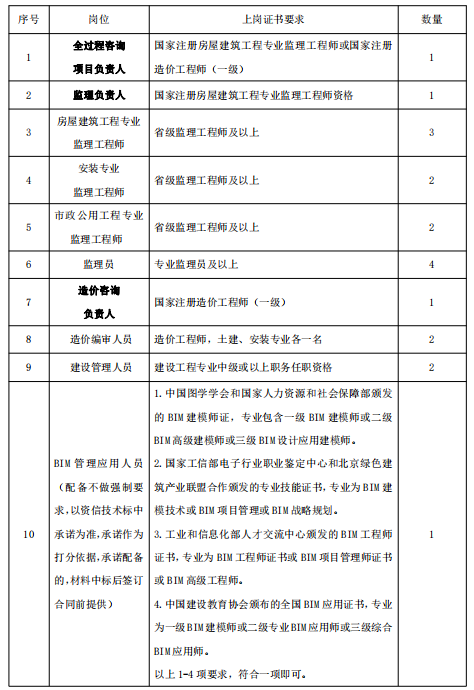 3.2.1全過程咨詢項(xiàng)目負(fù)責(zé)人資格要求:國家注冊房屋建設(shè)工程專業(yè)監(jiān)理工程師或國家注冊造價工程師(一級)。且在投標(biāo)截止時間前未在其他項(xiàng)目中承擔(dān)任何崗位的任何職務(wù)。