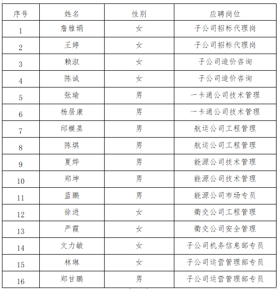 根據(jù)《衢州市交通投資集團有限公司招聘公告》要求,現(xiàn)將擬錄用人員名單公示如下: